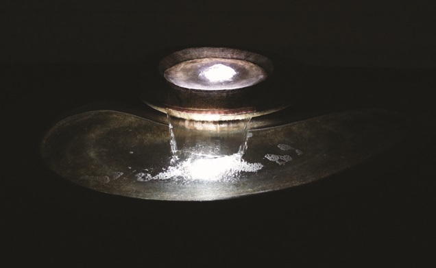 A smooth, modern stone fountain featuring a rounded upper bowl that spills gently into a wide lower basin. The clean, sculptural shape and steady water flow create a calm, elegant accent for patios, garden paths, or entryways.