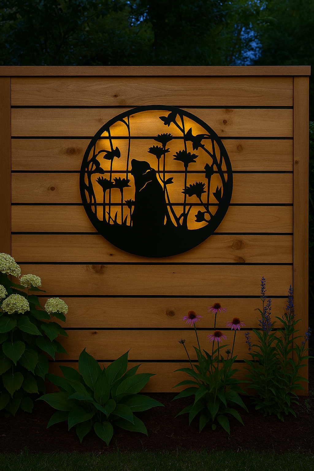 It’s a circular metal silhouette showing a cat sitting among tall flowers with butterflies drifting around, and the piece is designed to include a built‑in solar light feature that illuminates the scene at night. 23.75" diameter.