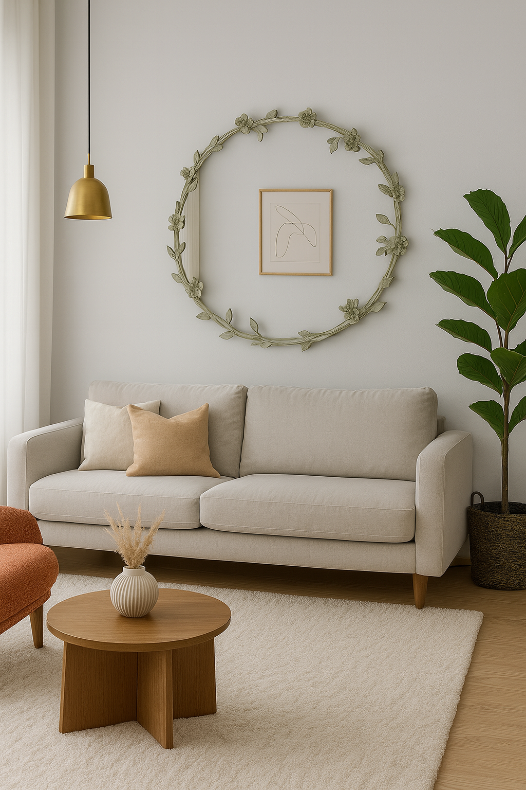 A nature‑inspired round wall mirror with an ornate vine-and-floral frame that brings a touch of elegance to any space. The detailed leafy design wraps gracefully around the circular mirror, creating a soft, organic look that works beautifully in entryways, bedrooms, living rooms, or boutique-style décor. Approximately 24'' in Diameter