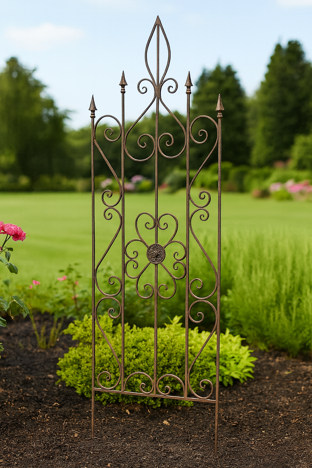 Elevate your outdoor space with this elegant wrought iron garden trellis, designed to blend timeless artistry with practical support for climbing plants. Featuring intricate scrollwork and a central floral medallion, this trellis adds a touch of charm to any garden or landscape. Approximately 7' Tall
